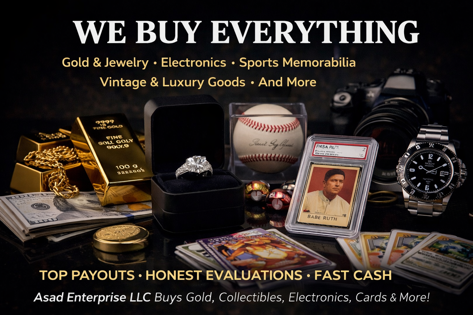 Asad Enterprise LLC is a multi-division acquisition company specializing in purchasing valuable assets across multiple industries. We buy precious metals, jewelry, electronics, sports memorabilia, collectibles, and a wide range of other high-value items. Our mission is simple: provide fast evaluations, fair market pricing, and a professional, transparent buying experience.